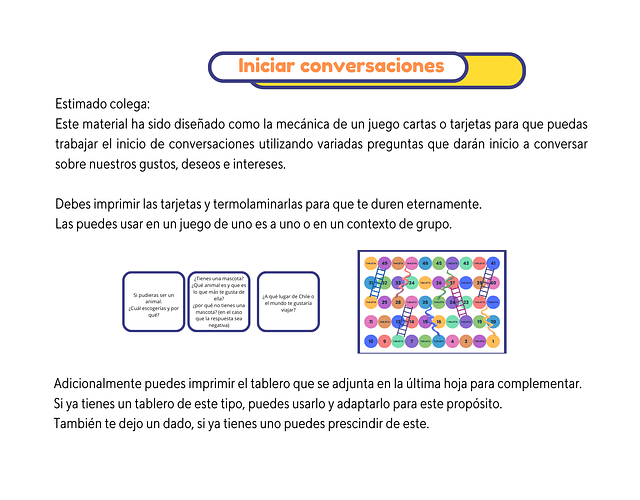 A partir de un tablero de juego y sencillas cartas con preguntas para iniciar temas de conversación, los niños, cada uno en su turno, deben ir alternando entre realizar y responder a las preguntas que aparecen en las casillas con la denominación "tarjeta".